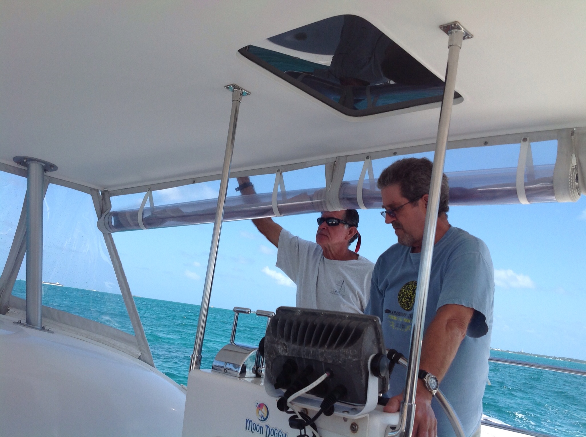 Wednesday morning we had a relaxed morning at the Conch Inn and left Marsh Harbor on the 10:30 a.m. ferry headed to Hope Town. Ron Engle, our host, met us at the ferry dock and took us over to Moon Doggy, the 30 ft catamaran that will be our home for the next week. We immediately began the boat briefing. He showed Jay and Lyse all the workings of the boat.