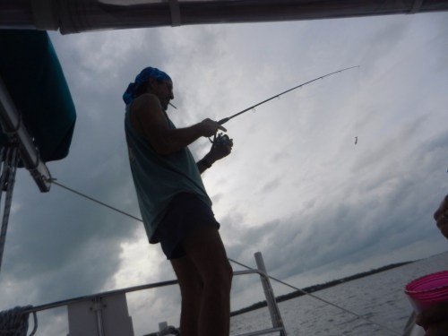The snorkelers reported an okay snorkel. Lyse was pleased to see some new coral growth, although she said she got a little cold toward the end. They saw a barracuda, a grouper guarding his home near some cinder blocks, a small lobster, a giant starfish, lots of small tropical fish, a HUGE starfish.and the BIGGEST sea cucumber they have ever seen. They also saw a barbeque pit and some random garbage. Stephen caught two small yellowtail snapper which he intends to use for cut bait.