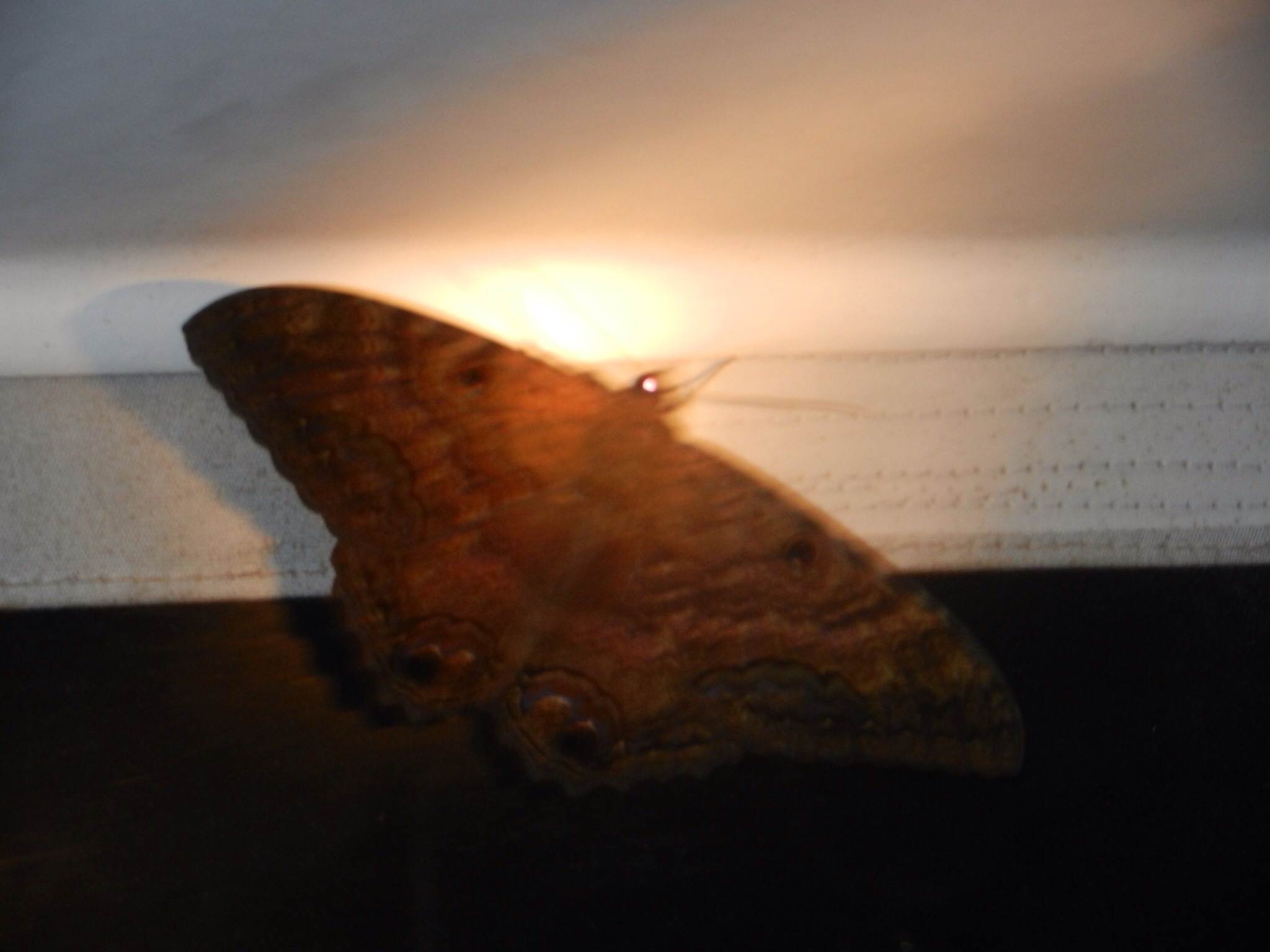 We expected a thunderstorm in the night so we put down the eisenglass protection all around. Just before retiring, a large moth flew into the cockpit and startled us. It was actually quite lovely.