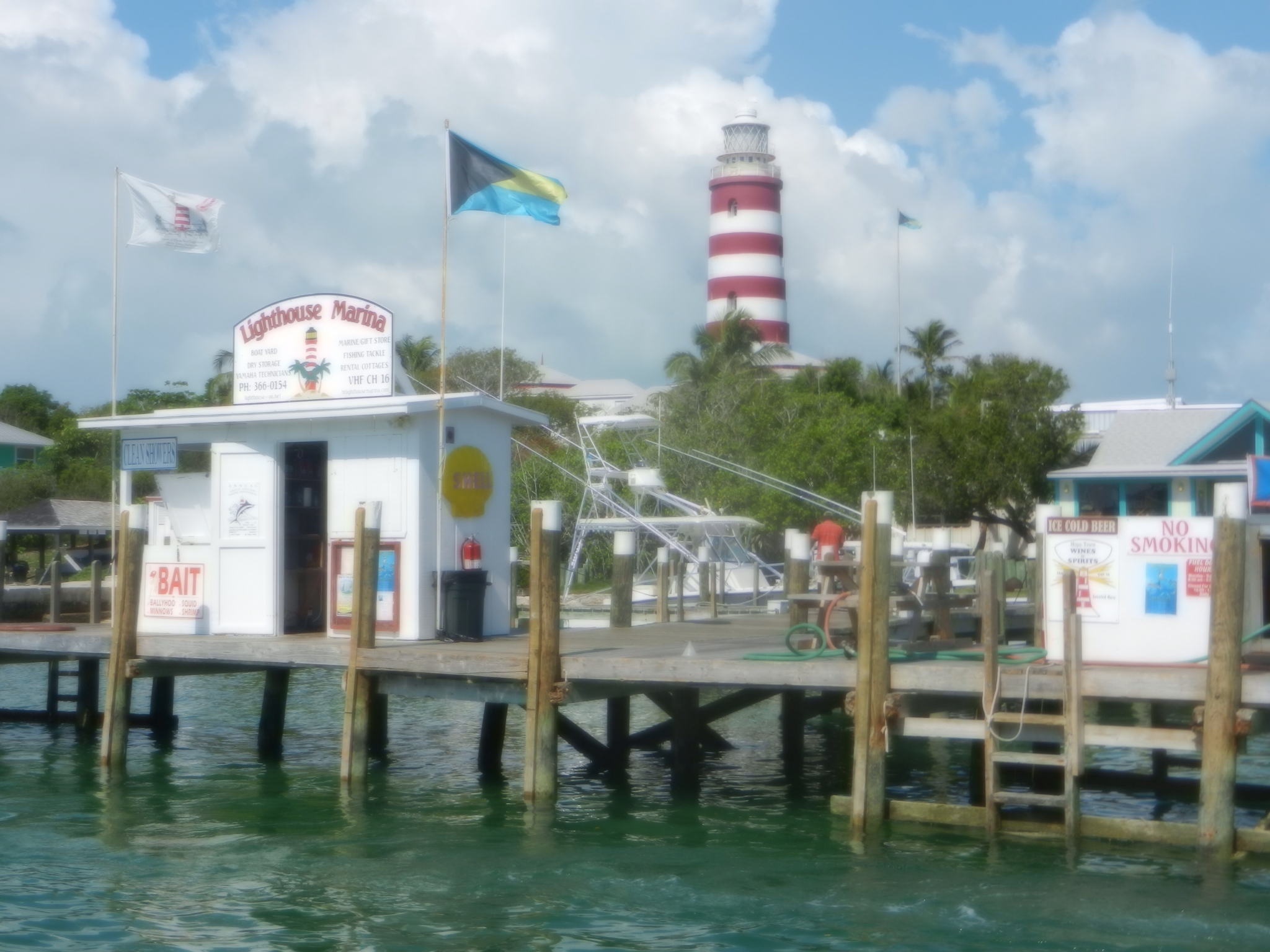 The historic but still functioning Hope Town Lighthouse can be seen in the distance behind the Lighthouse Marina. It is preserved by donations and still works in the old way without modern technology. The white light is occulting with five flashes and a period of 15 seconds and arrange of 23 miles.