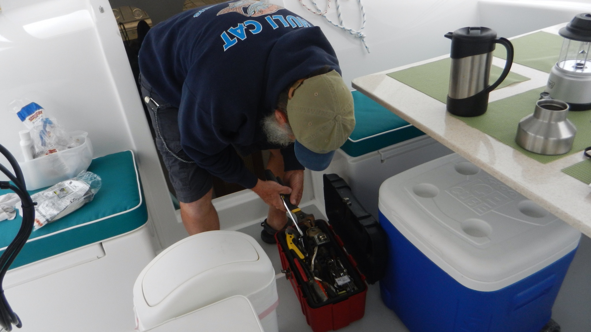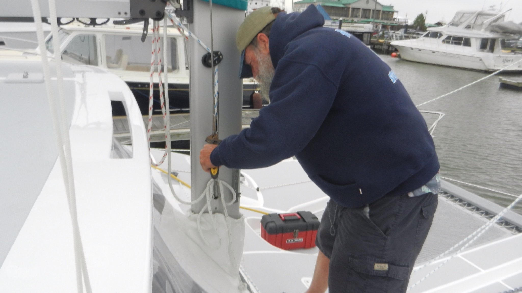 He and Arlene worked together to try to eliminate the problem of water leaking down the mast into the cockpit and hall closet.