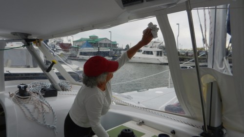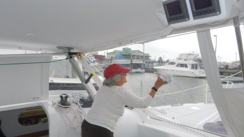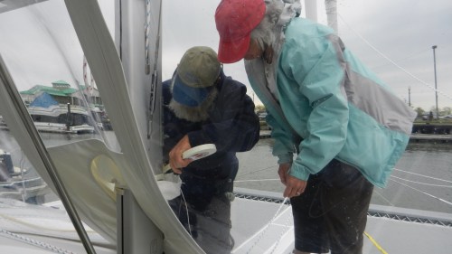 Arlene worked hard washing and polishing all the eisenglass windows. Ralph tightened the rigging and made us a “Turk's head” to mark the center of the wheel.