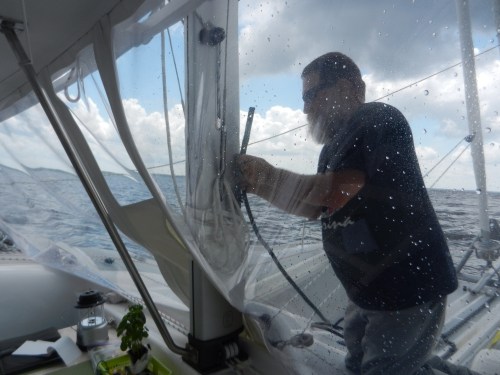 Shortly after passing through the bridge there were thunderstorms all around. We put out the lightning strike preventer. We put down the eisenglass, but actually we never got much rain. The storms seemed to be going behind us.