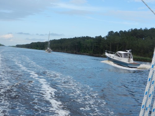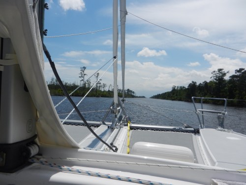 At 2:15 we left the Alligator River behind and headed into the Alligator Canal. The canal connects the Alligator River and the Pongo River. Belhaven, our destination, would be in the Pongo River. We rolled the eisenglass back up. It had warmed up and there were no more thunderstorms in the sky
