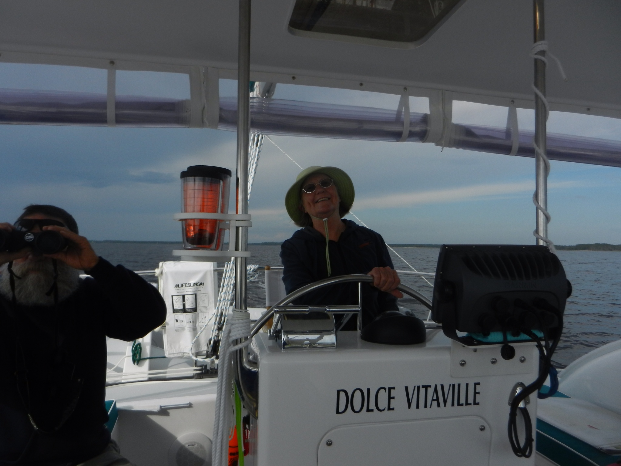 Eventually we came to the Wilkerson Bridge. After that we would be in the Pongo River. Franci got to take the helm and steer us to the final anchor spot close to Belhaven.