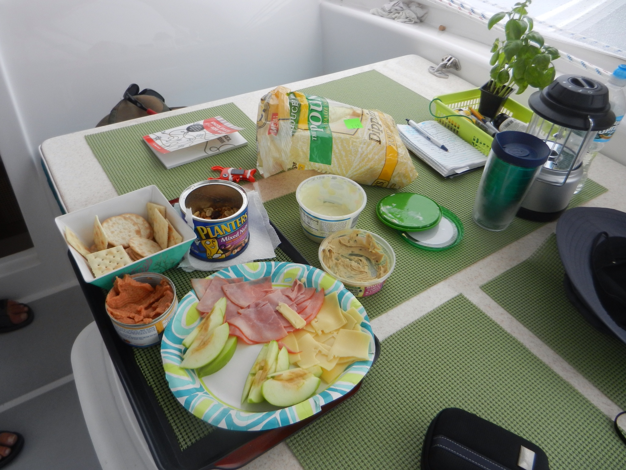 At 2:30 Arlene brought up the snacks……ham, cheese, apples, crackers, chips, humus, blue cheese dip, bean dip and mixed nuts. She took over the helm so Franci could take a break.