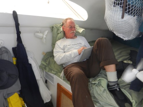 At 2 p.m. it began to rain. Stephen and Arlene put down the eisenglass. We had things open before. It is no longer cold, I don't think we'll need our long underwear anymore.