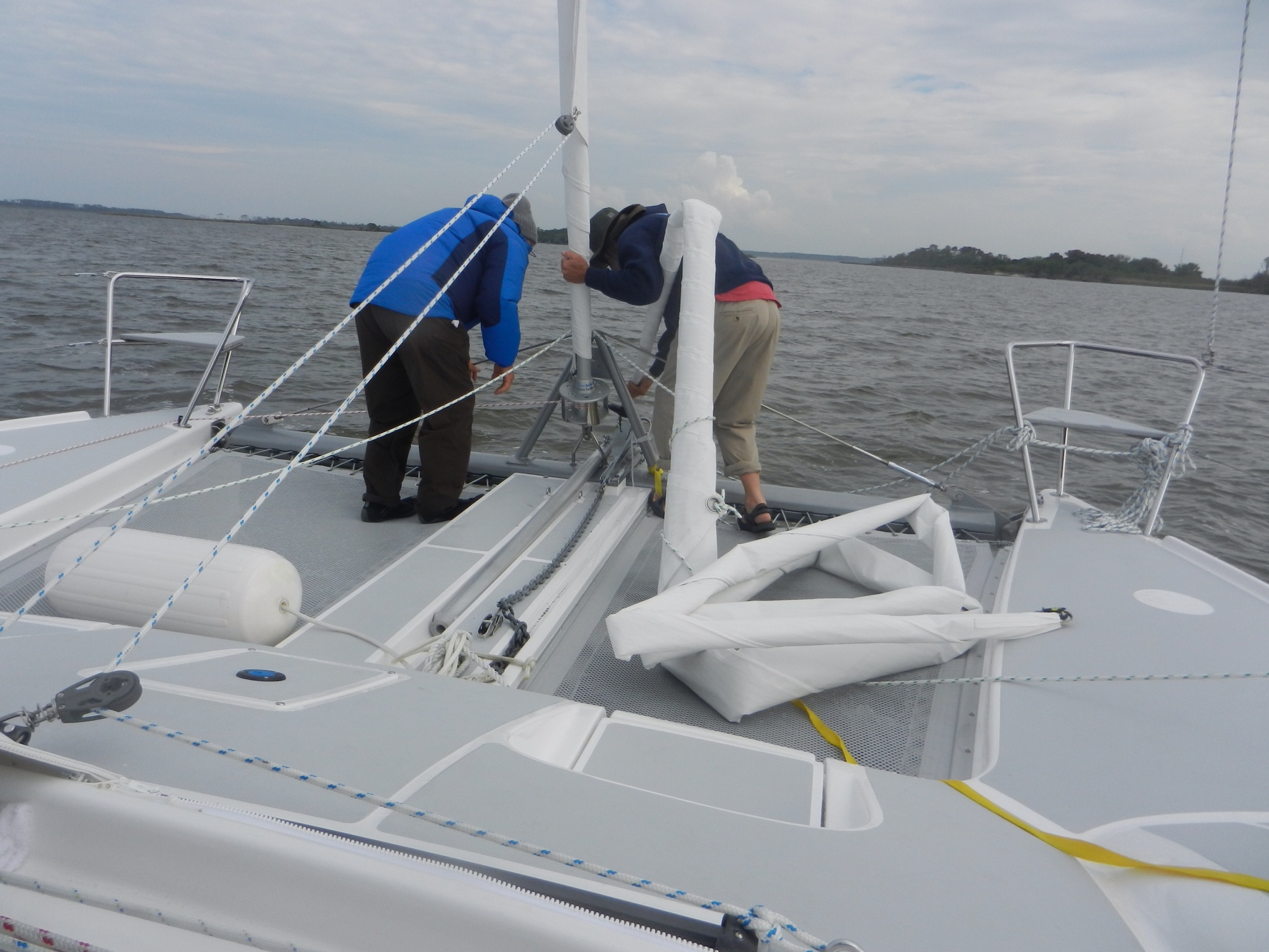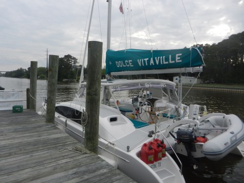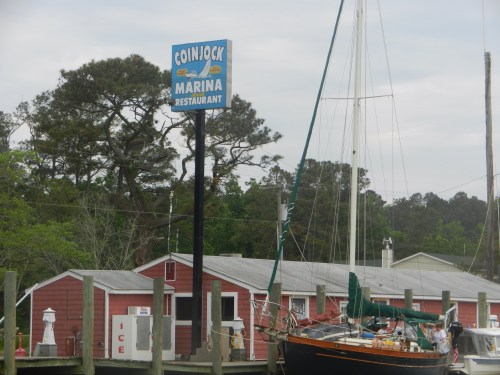 We arrived at Coinjock Marina around 5:30 p.m. Before arriving we took down the screecher and rolled in the bowsprit because boats at Coinjock are tied close together.