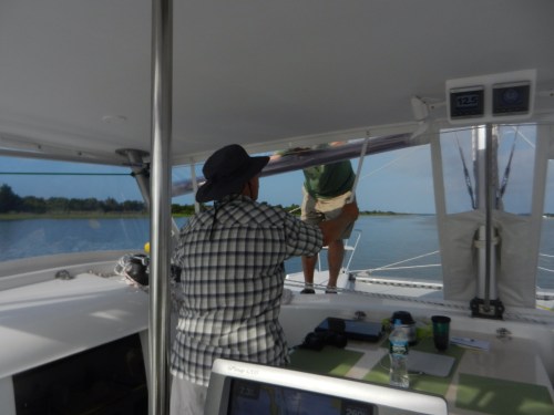 Stephen and Ralph roll up the eisenglass to let the breeze flow through.