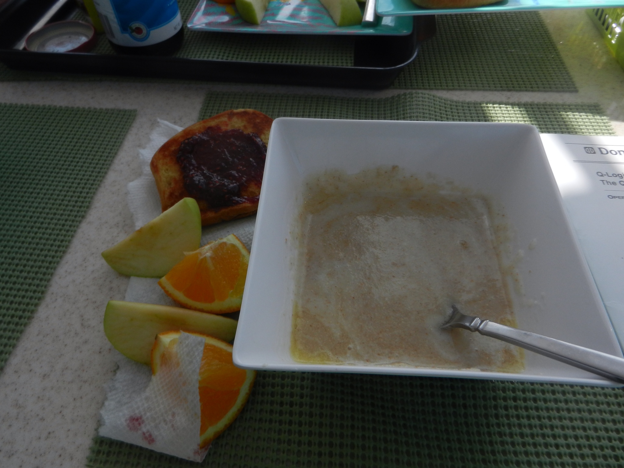 About mid morning we had a hearty breakfast with cream of wheat, fruit and toast.