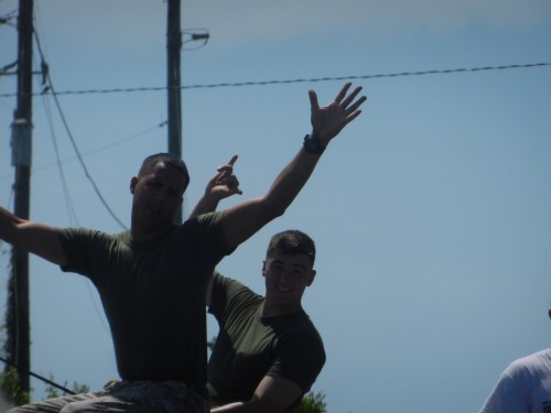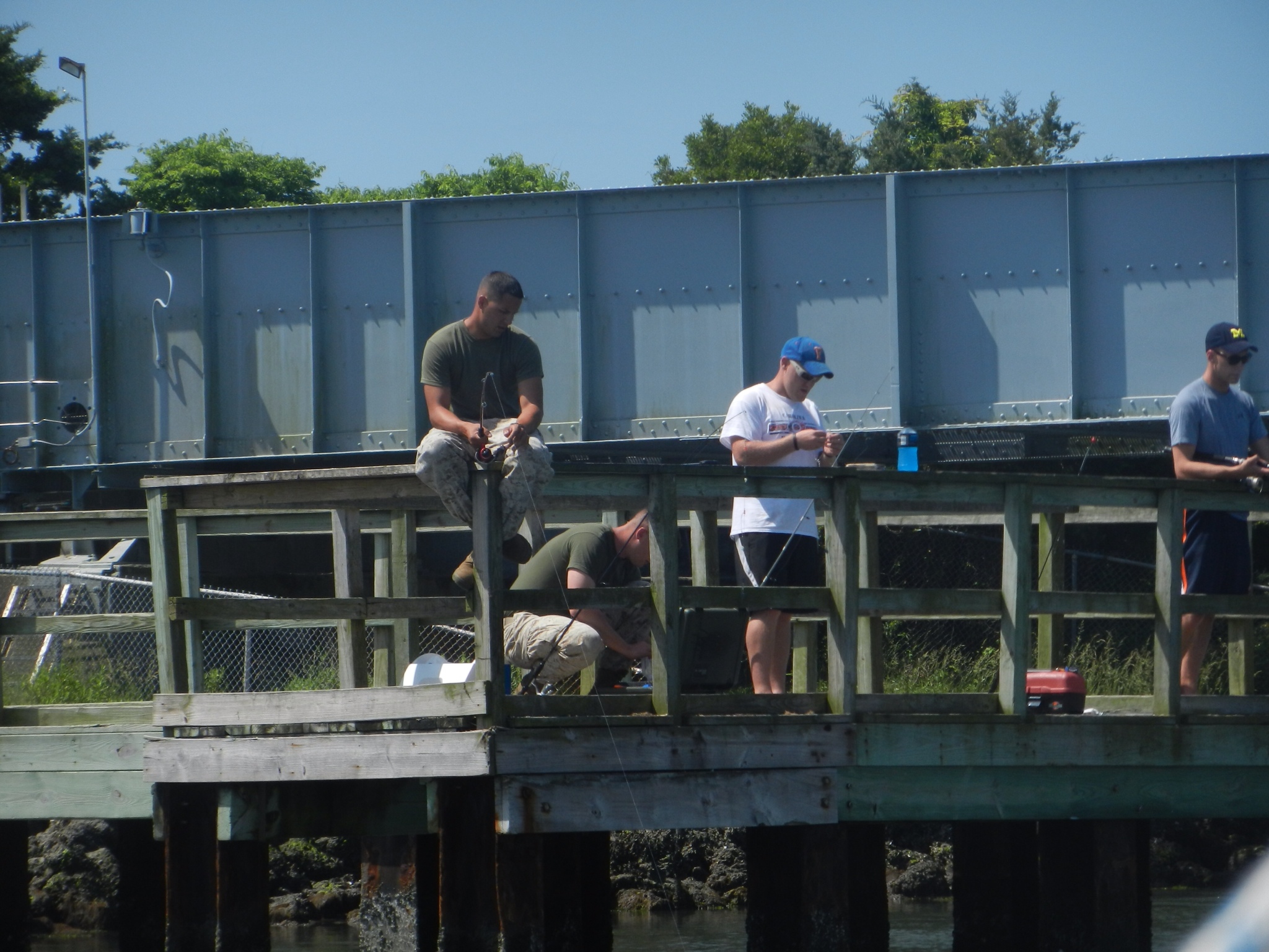 We waited on several bridges that day. At 11a.m. we waited for the Onslow Bridge, a swing bridge. There were a number of folks fishing there. We were not far past Camp Lejeune, note the military guys.