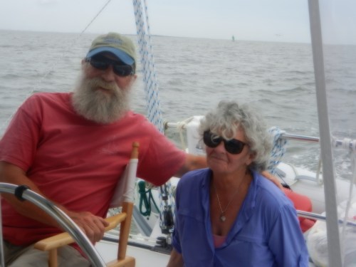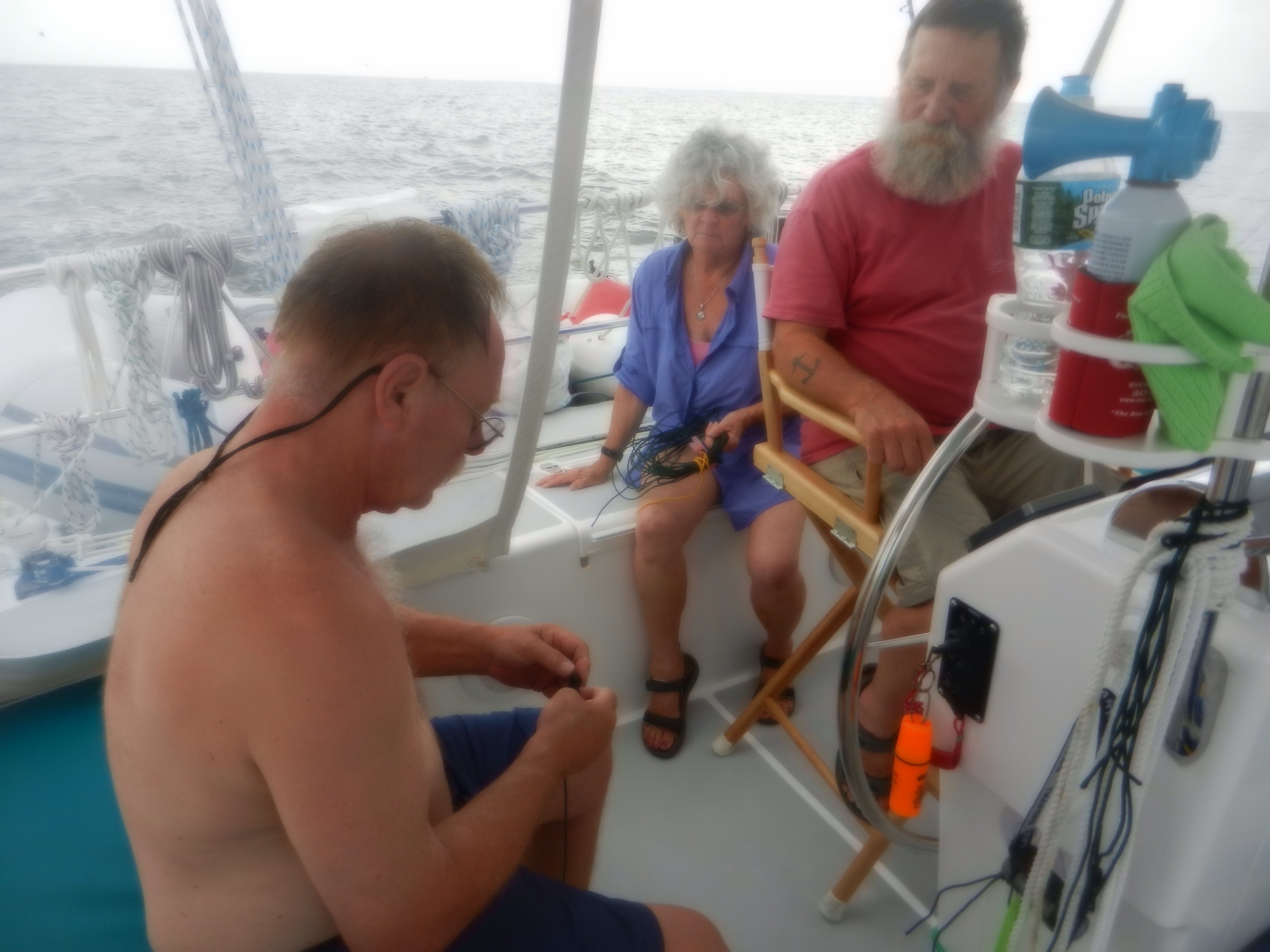 Last night we had found an anchor spot close to Daulphin Island following our long, stormy trek in from off shore where we got caught in yet another tropical depression. Before retiring we closed up all the hatches and eisenglass in anticipation of more rain to come. Around 3 a.m. Franci awoke realizing that she and everything around her was wet. The hatch above the bed had not been closed and it had rained heavily. Stephen and Franci arose and took all the wet bedding off the wet bed. Franci put on dry clothes. We were able to put a towel over the wettest spot and with a dry blanket got a few more hours of sleep.