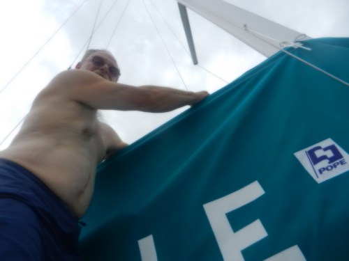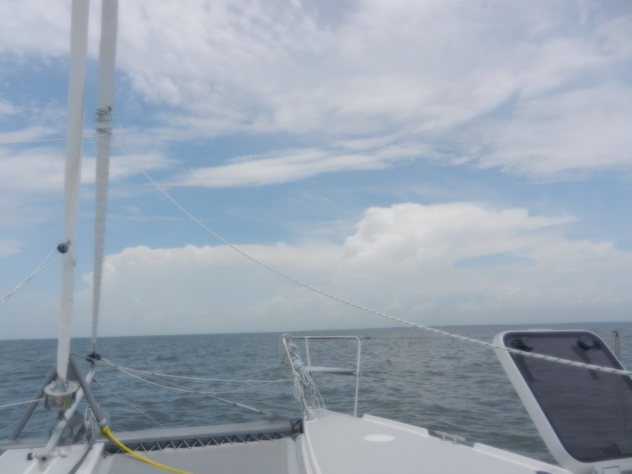 We had tuna sandwiches for lunch and listened to the afternoon weather report. We noted that we no longer saw blue skies ahead. The marine weather station spoke of more thunderstorms to come and put out warnings about a water spout that had been spotted. The storm was not over yet. Down came the eisenglass again.