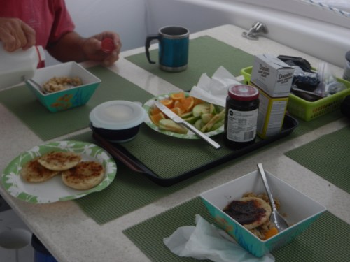 It was still raining off and on that morning, sometimes very heavy. We were rocking and rolling even in the ICW. We were all happy not to be off shore anymore. We ate a good breakfast with oatmeal, fruit and English muffins.