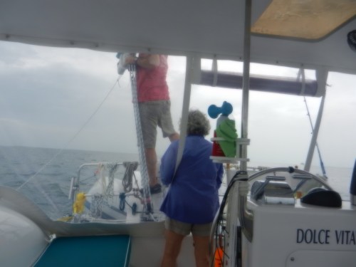 Late morning the rain subsided and we could see blue skies ahead. Arlene began puttering and cleaning up the boat. This led to a decision to empty water out of the main sail cover which led to tightening the rest of the loose screws. it soon became an all hand's on deck activity and everyone had a part in the action. After all was done, Stephen zipped up the sail cover so if it rains again, water will not get in