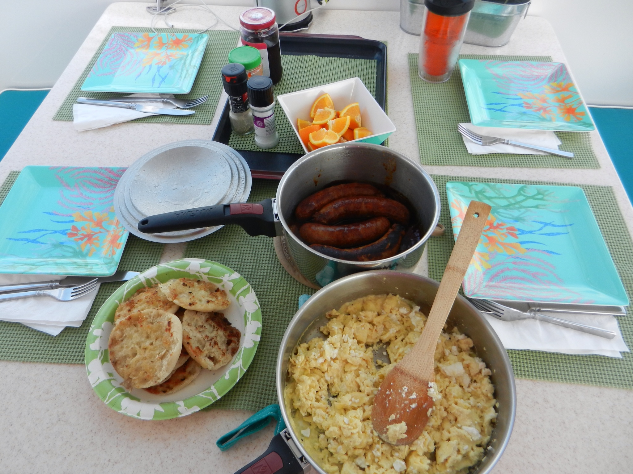 We had a wonderful breakfast with scrambled eggs and the homemade sausage we received in our gift basket in Delcambre. Yum. The sausage was very good and very different…..sorta sweet but with a bit of a bite. Great breakfast.