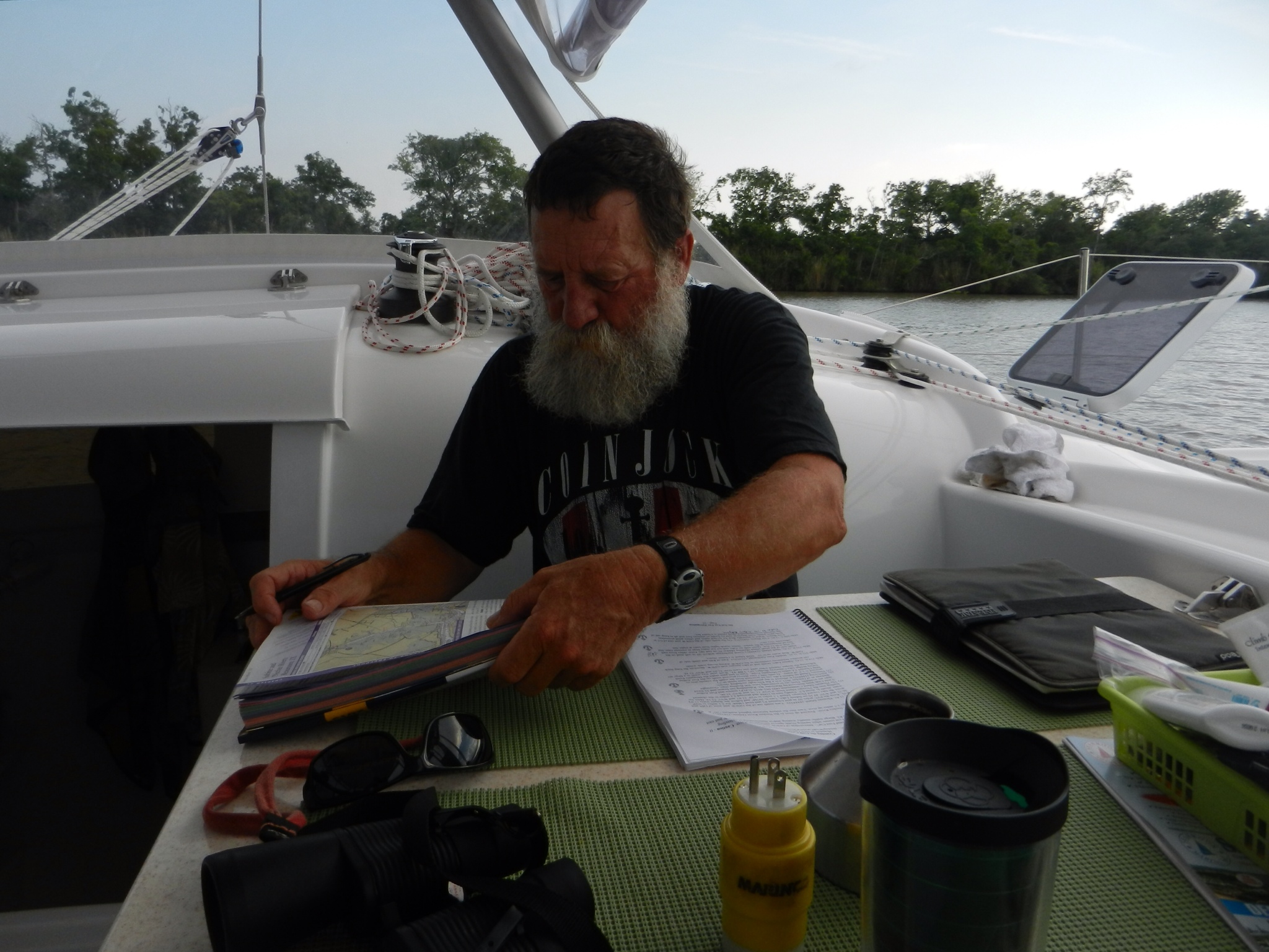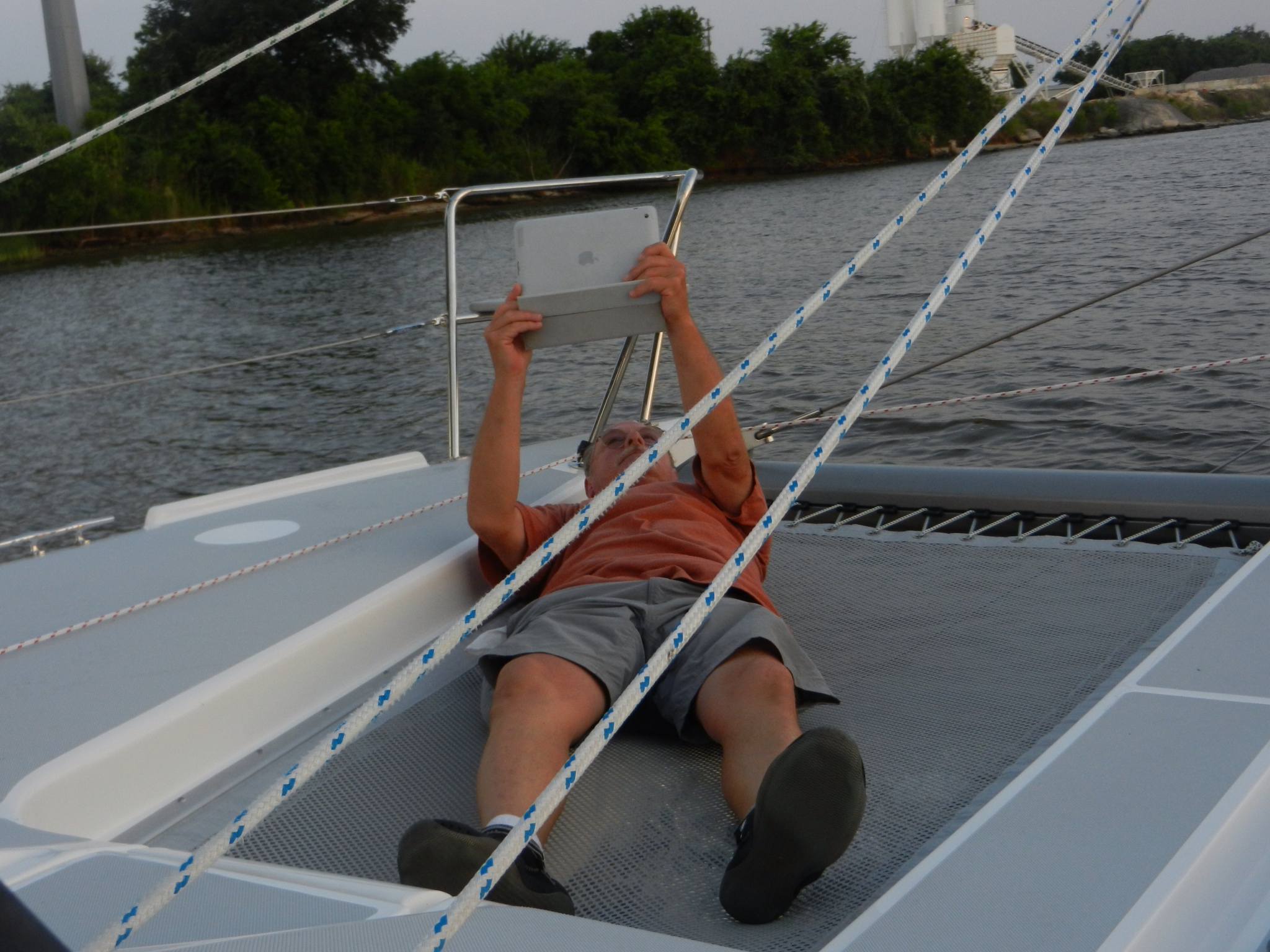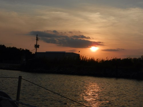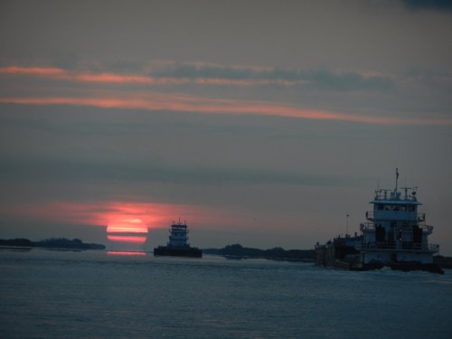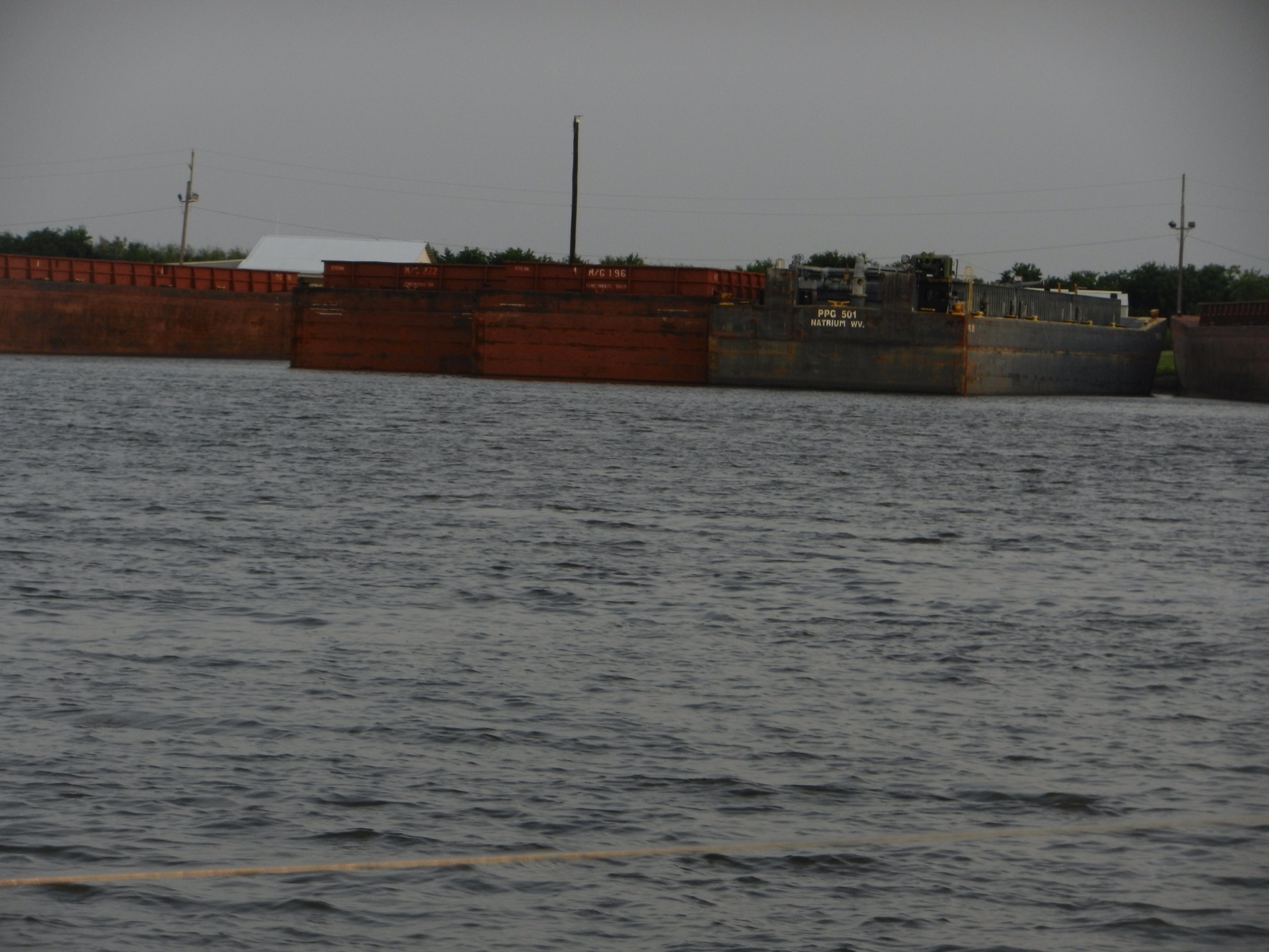 Around sunset we saw the most traffic we saw all day. We crossed the Calcasieu intersection of the ICW coming from Calcasieu Lake into the Calcasieu River headed north to Lake Charles.. We were glad to be there before dark. There were lots of barges and tug boats, many moving and even more parked. We saw another sailboat that had been anchored for four hours waiting for the 50 ft. bridge to open. We were happy to have made it under ourselves with inches to spare. Ralph helped the sailboat communicate with the bridge operators. They were anchored in a bad spot in a busy intersection. All were glad to see them get through the bridge.