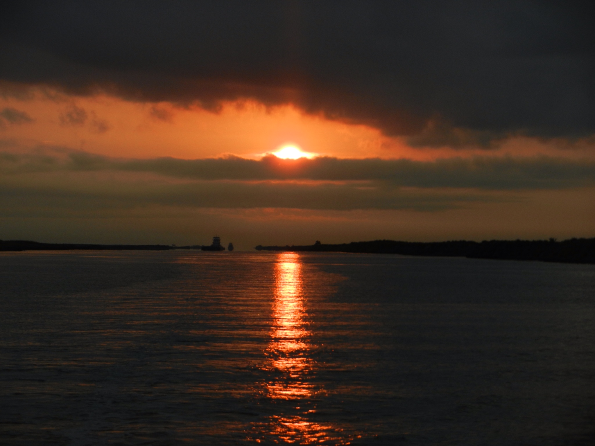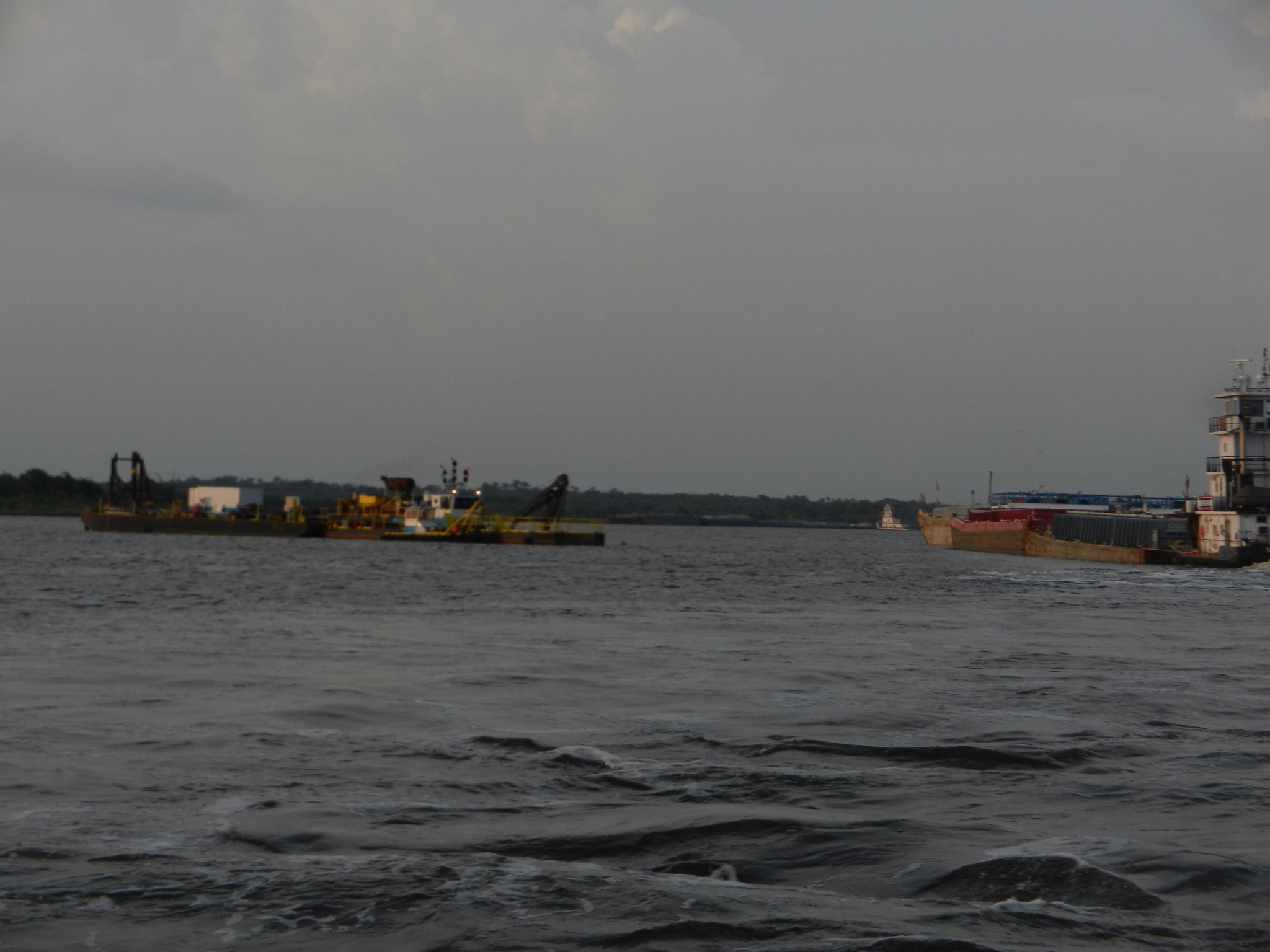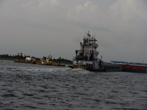 Then the adventure began. First a storm hit with lots of lightning and winds up to 40 or 50 mph. Soon after that the decision was made to continue on through the night. We had only planned to stop for a few hours anyway and somehow the thought of messing with docking and lines in the rain was not appealing. We also had made friends with a tug, Miss Kelly, and had arranged to follow him through the night.