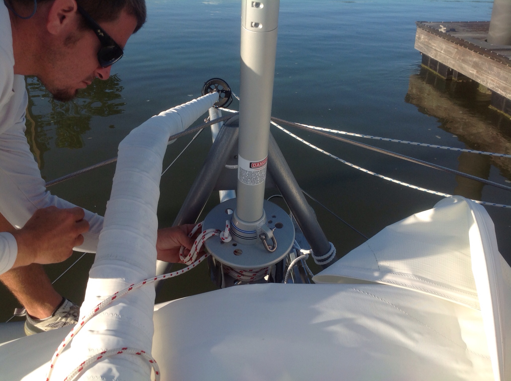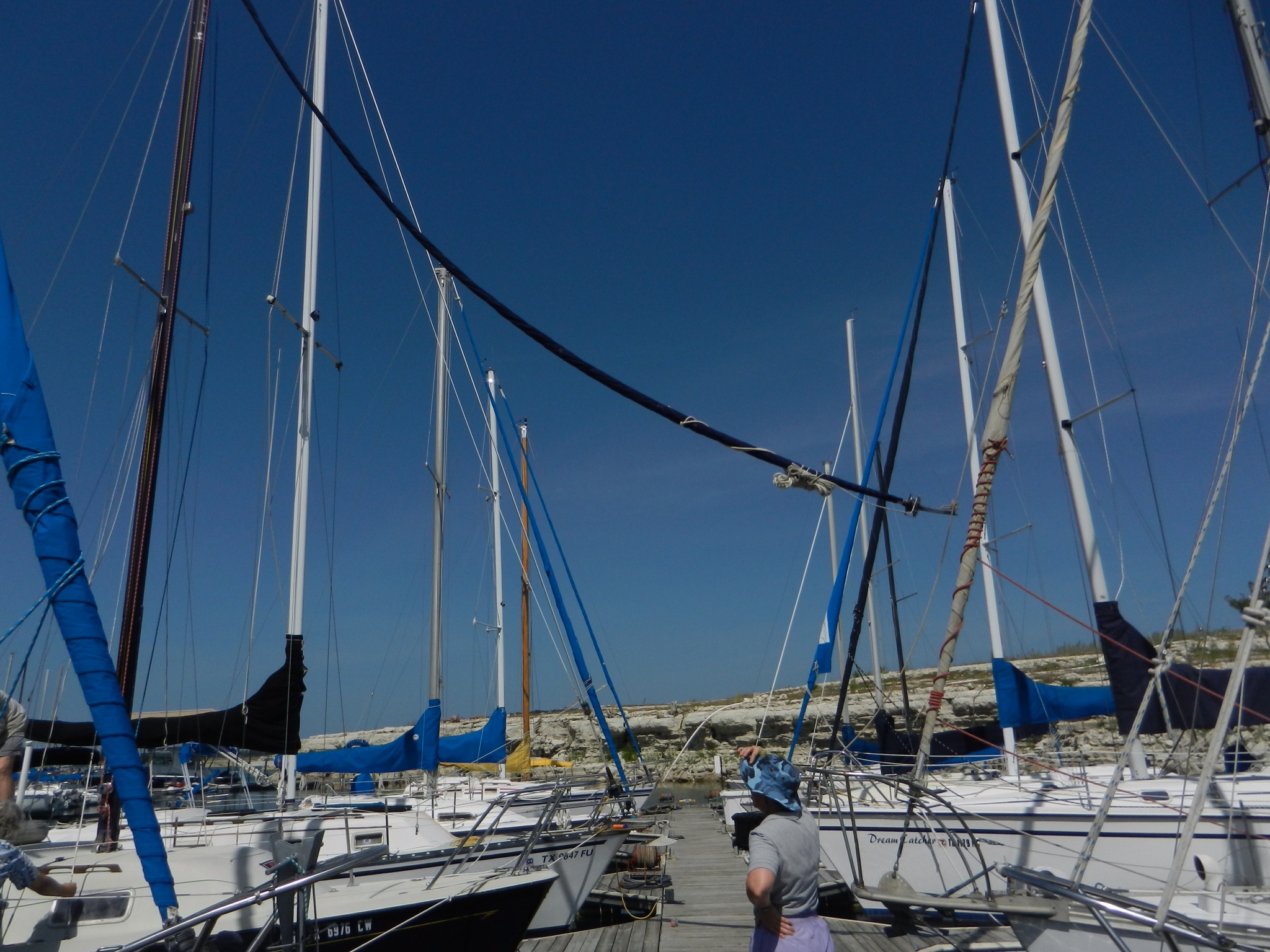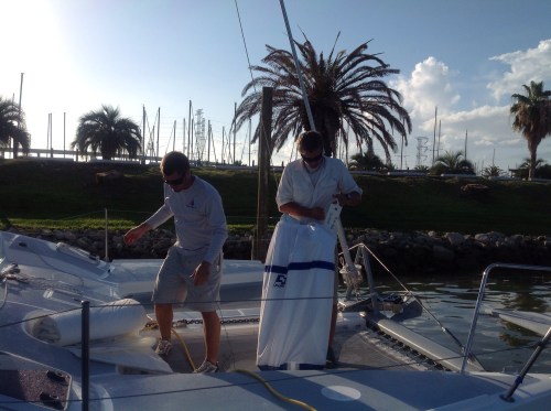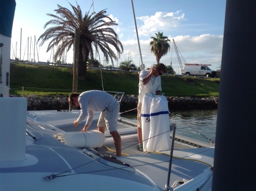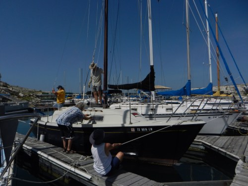 Wednesday morning we were up early ready to greet the guys from Stix N'Rign at 7a.m. They went to work dismantling the wiring and lines about the mast. They put away the screecher and jib sail. They marked and labeled each of the lines and wires as they disconnected them.